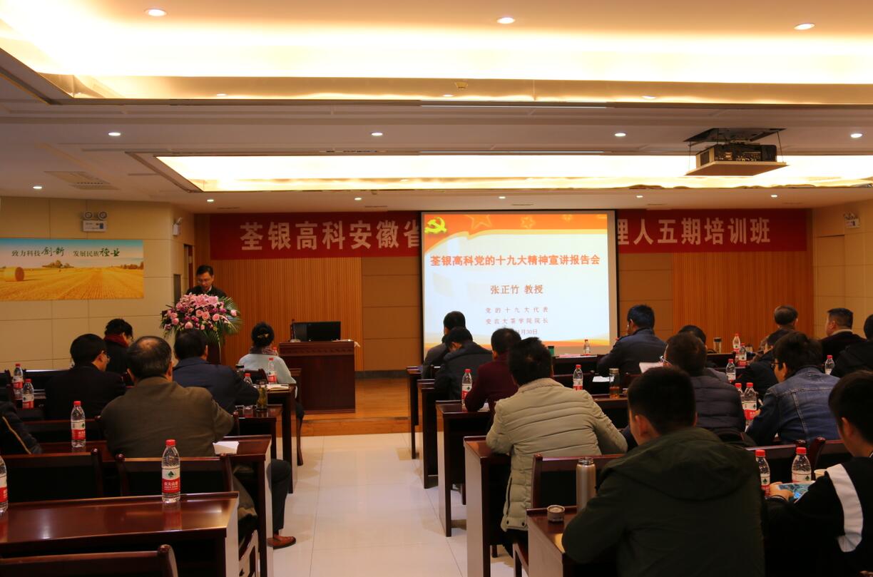 2017年11月30日上午,为深入学习宣传中国共产党第十九次全国代表大会精神,荃银高科邀请党的十九大代表、安徽农业大学茶与食品科技学院院长张正竹教授来公司作党的十九大精神宣讲。宣讲报告会在荃银高科六楼多功能厅举行,公司经营班子成员、全体党员、安徽省首届农业职业经理人学员以及公司部分员工参加了学习。会议由公司党支部书记廖孝波主持。